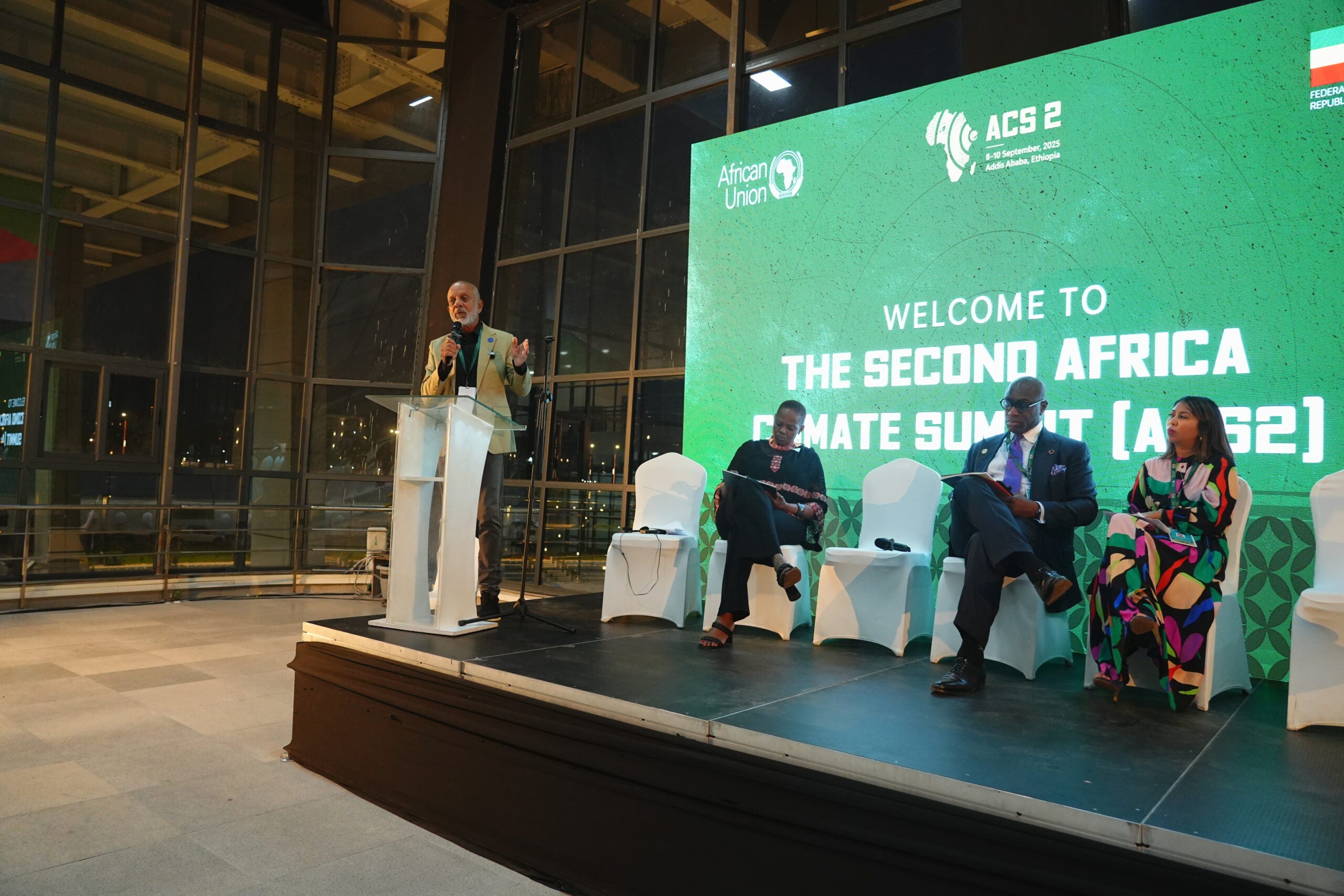 Participants standing together at the Second Africa Climate Summit 2025 (ACS2) in Addis Ababa, Ethiopia, under the theme “Accelerating Global Climate Solutions: Financing Africa’s Resilient and Green Development.”